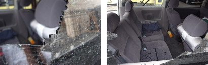 自動車の窓ガラスはフロントガラス以外は強化ガラスを使用している事が多く、万が一ガラスが割れてしまった場合では「バンッ!」という音とともに細かく割れて飛び散ります。