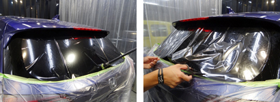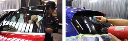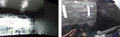 リアガラスのように湾曲した3時曲面のガラスには熱加工を施し、繋ぎ目のないキレイな仕上りを心がけて施工しています。