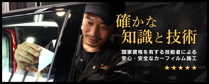 当店ではカーフィルム施工の国家資格を取得したスタッフが、お車のフィルム施工致します。近年、多くのショップでカーフィルム施工を行っていますが、確かな知識と技術をもった専門店だからこそ、お客様にとって安心・安全なサービスをご提供できると考えております。